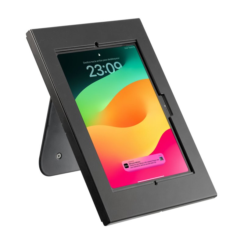 Además, el soporte integra una inclinación ergonómica fija de 30°, ofreciendo un ángulo cómodo para visualización e interacción con el dispositivo en aplicaciones de autoservicio o atención al cliente.