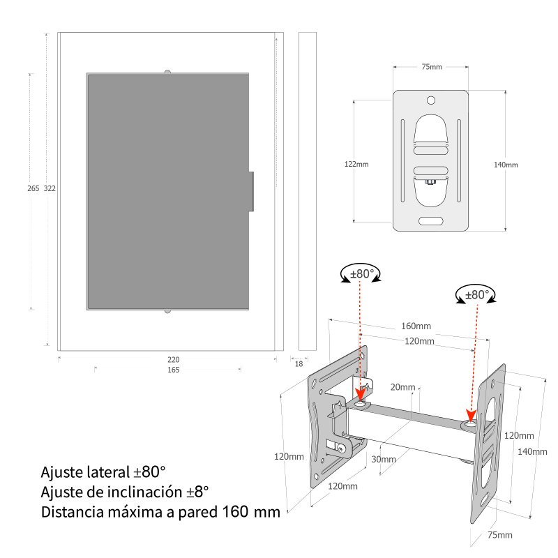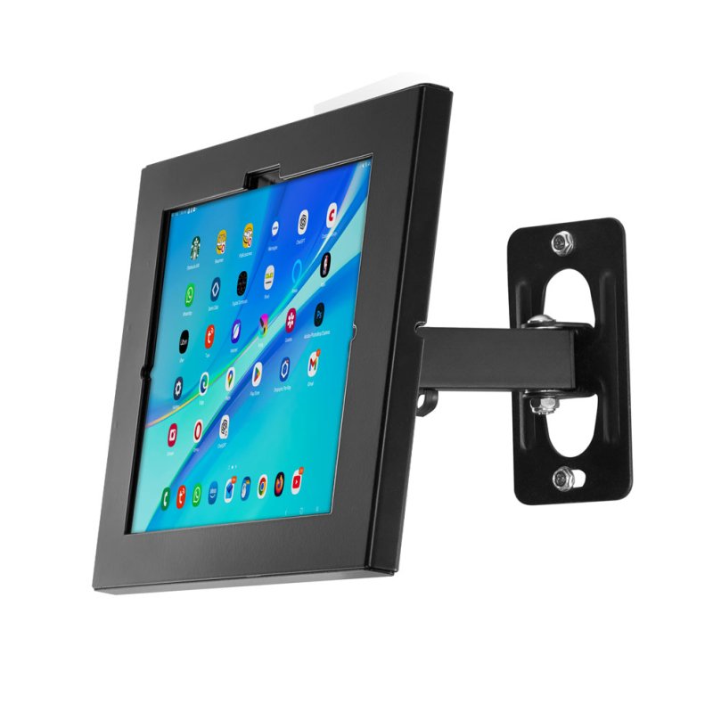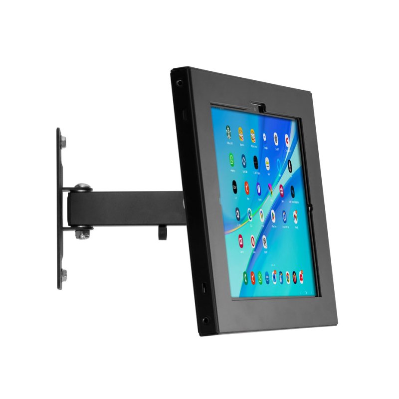 El TSCLK21W06 es un sistema de montaje de muros y paredes de alta seguridad diseñado para la instalación profesional de tabletas en espacios públicos, comerciales e institucionales. Este producto integra un soporte metálico de pared con doble articulación y una caja antirrobo reforzada, ofreciendo una solución confiable, funcional y estéticamente discreta para el uso controlado de tabletas.