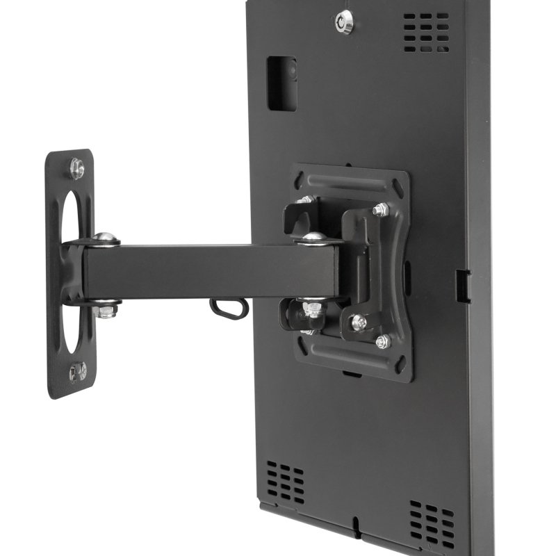 El soporte LK21 cuenta con una base de acero firme y estable que se fija directamente al muro mediante tornillería de seguridad tipo Torx incluida. Su diseño de doble articulación permite movimiento lateral y ajuste de inclinación, facilitando una interacción cómoda para el usuario sin comprometer la estabilidad. El poste de aluminio de formato trapezoidal incorpora grapas para el manejo interno del cableado, manteniendo una instalación limpia y ordenada. Además, el sistema puede ensamblarse previamente antes de su colocación en pared, agilizando el proceso de instalación.