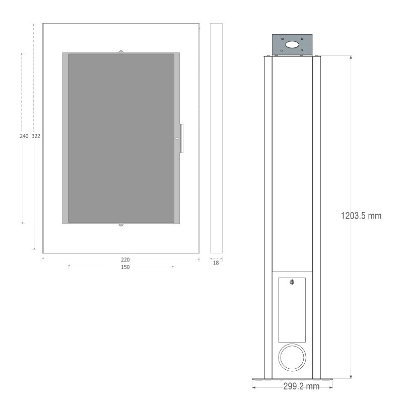 El pedestal LK30 está fabricado en acero de seguridad y cuenta con una base sólida de piso que se fija mediante placa perforada, garantizando firmeza estructural. Su poste metálico de 30 mm de diámetro y 1000 mm de altura incorpora manejo interno de cableado para mantener una instalación limpia y protegida. La pantalla permite una inclinación fija de 30°, facilitando la visualización del usuario. Además, integra un compartimiento inferior con puerta y chapa de llave bancaria, ideal para resguardar cableado o dispositivos complementarios, con entrada inferior para cableado interno.