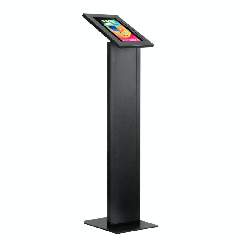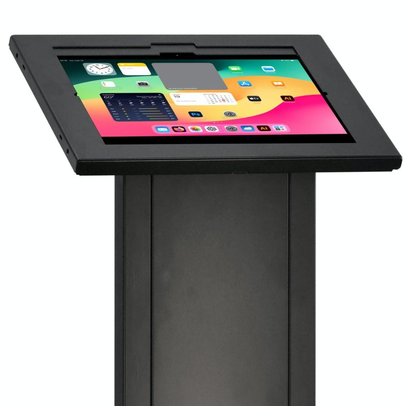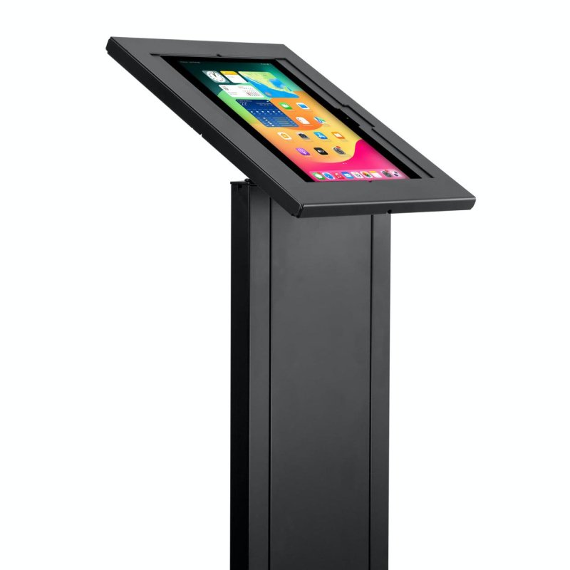 Pedestal de piso con caja antirrobo metálica para iPad de 11 pulgadas, ideal para entornos comerciales seguros.