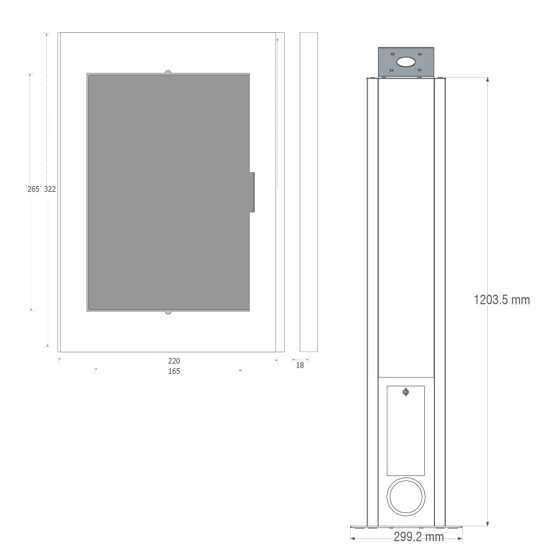 El pedestal está fabricado en acero de seguridad y cuenta con una base sólida perforada para fijación al piso, lo que garantiza firmeza estructural. Su poste metálico de 30 mm y 1000 mm de altura incorpora gestión interna de cableado para mantener una instalación limpia y protegida. La pantalla mantiene una inclinación de 30°, facilitando la interacción del usuario. Además, incluye un compartimiento inferior con puerta y chapa de llave bancaria, ideal para resguardar cableado o accesorios, con entrada inferior para cableado interno.