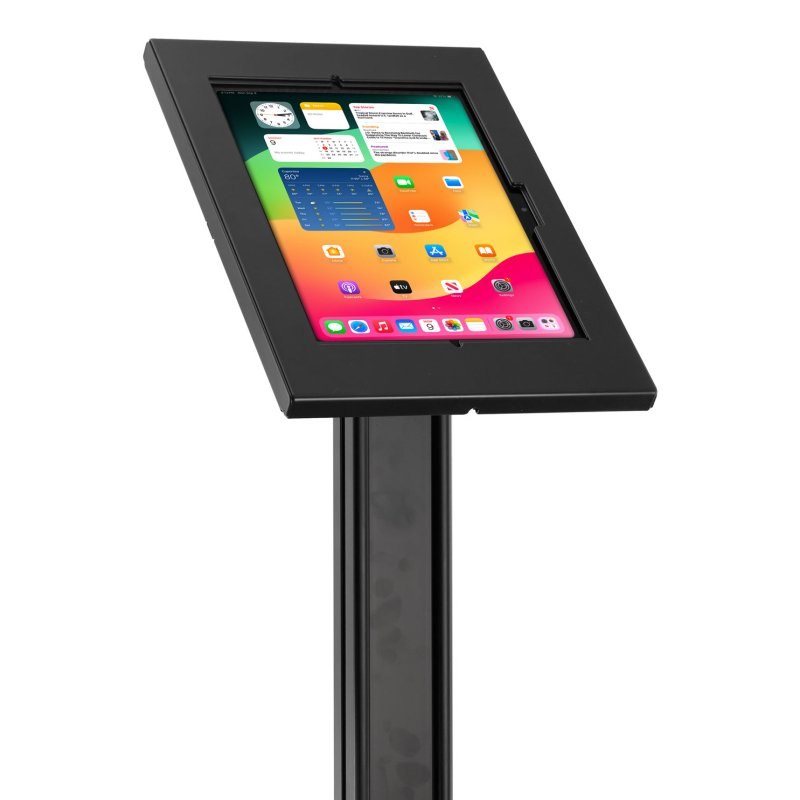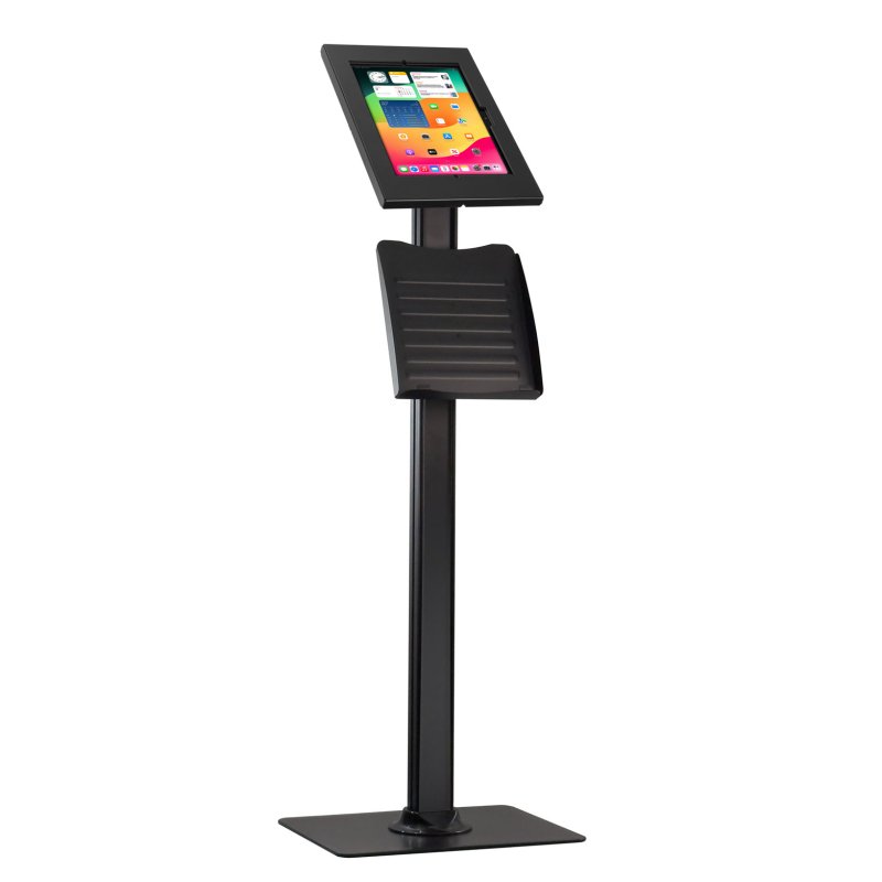 Pedestal de piso antirrobo con caja metálica segura, ideal para iPad de 11 pulgadas en entornos comerciales y públicos.
