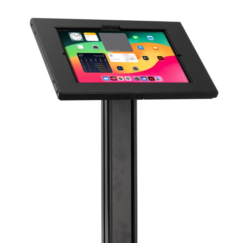 El pedestal LK32 está fabricado en acero y cuenta con una base atornillable al piso que proporciona firmeza y rigidez incluso en zonas de alto tránsito. Su perfil metálico permite el manejo interno del cableado, manteniendo una instalación ordenada y segura. La pantalla puede rotar libremente en 360 grados con bloqueo a 90 grados, mientras que la cabeza de inclinación graduable permite ajustes de hasta +75 grados, optimizando la visibilidad y la interacción del usuario. El poste metálico tiene una altura de 1100 mm, ideal para kioscos de autoservicio, puntos de información, control de accesos y exhibiciones digitales.