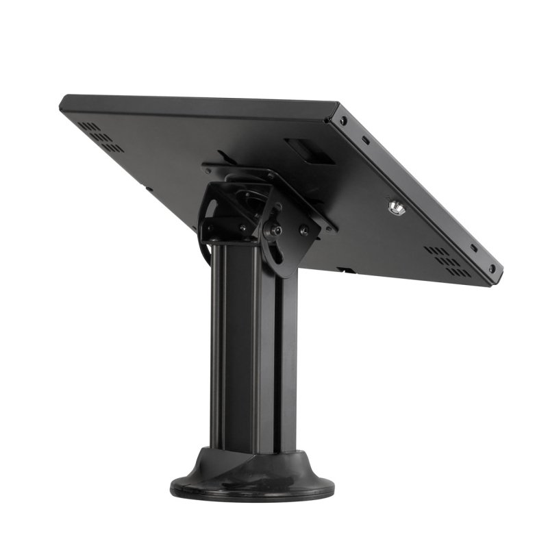 El soporte LK7 está fabricado en acero resistente con acabado metálico negro, brindando durabilidad y presencia profesional. Su base circular de acero se fija mediante tornillos, proporcionando firmeza en puntos de venta, recepciones o kioscos informativos. El poste metálico de 190 mm de altura integra manejo interno de cableado para mantener una instalación ordenada. Ofrece rotación de pantalla libre en 360° con bloqueo a 90°, así como inclinación ajustable de 0° a ±89°, permitiendo una interacción ergonómica desde distintos ángulos.